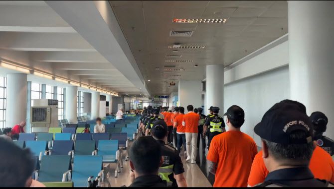 해외 도피사범 49명이 필리핀 니노이 아키노 공항에서 전세기에 탑승하기 위해 이동하고 있다. (사진=경찰청) |