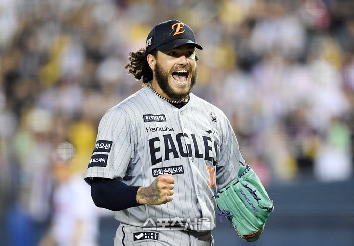 한화 폰세가 28일 서울 잠실구장에서 열린 2025 KBO리그 LG와 경기 6회말 2사 2루 상황에서 LG 오스틴을 좌익수 뜬공으로 잡아내며 이닝을 마치면서 포효하고 있다. 잠실 | 박진업 기자 upandup@sportsseoul.com
