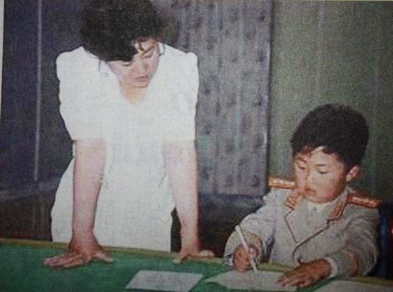 김정은 국무위원장의 생모인 고용희의 모습. 군복 차림으로 그림을 그리는 김 위원장을 고용희가 곁에서 지켜보고 있다. 마이니치신문, 연합뉴스 촬영. |