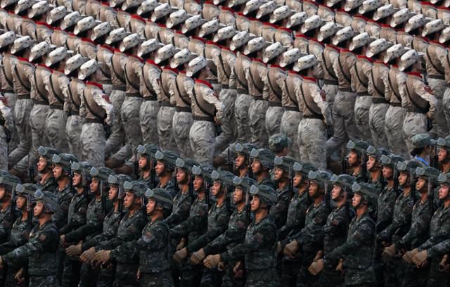 중국 인민해방군 병사들이 3일 베이징 톈안먼 광장에서 열린 열병식에 참여하기 위해 행진하고 있다. 베이징=EPA 연합뉴스