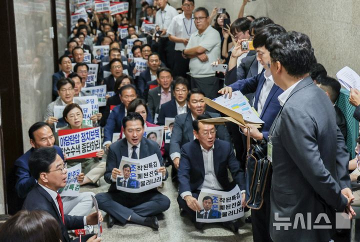 이날 내란특검 관계자들이 국회 국민의힘 원내대표실 압수수색을 위해 진입을 시도했지만 의원들의 반발에 불발됐다. 의원들은 국회 본관 원내대표실과 원내행정국 앞 복도 바닥에 앉아 대치를 이어가고 있다.