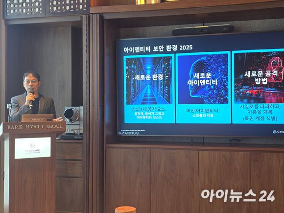 최장락 사이버아크코리아 이사가 3일 서울 강남 파크하얏트 서울에서 열린 '2025 아이덴티티 보안 환경 리포트' 발표 기자간담회에서 발표하고 있다. [사진=박정민 기자] |