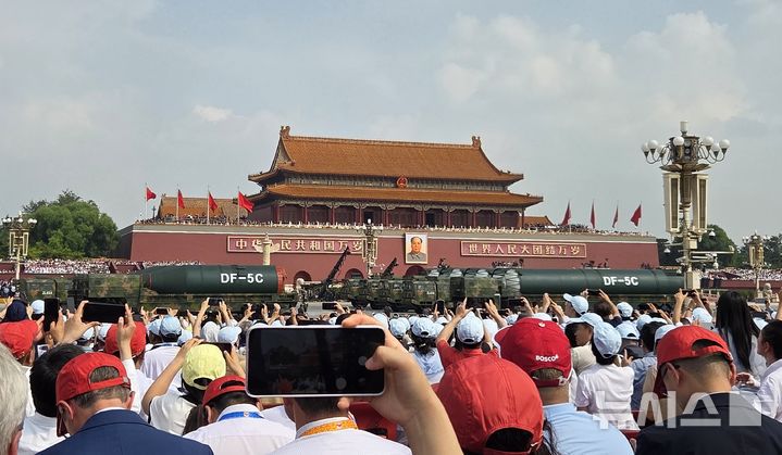 전승절 80주년 열병식이 열린 3일 오전 중국 베이징 톈안먼광장에 3단으로 된 로켓이 분리된 상태로 군 차량에 실린 채 참관객들에게 모습을 선보이자 현장에서는 탄성과 함께 박수갈채가 쏟아졌다.