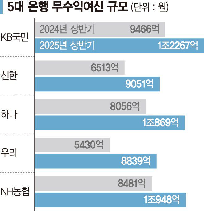 정부가 추진하는 100조원 규모의 국민성장펀드 출자와 상생금융 확대 등 기업대출 확대 정책이 이어질 경우 은행권 무수익여신은 더 늘어날 수 있다는 우려도 크다. 또 다른 금융권 관계자는 "정부가 기업대출 확대를 요구하면 무수익여신도 함께 늘 수 있다"며 "충당금 적립과 건전성 관리로 충격을 최소화할 것"고 말했다.