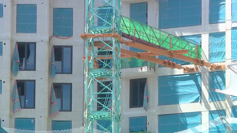 공사장 외벽에 작업중지 명령서가 붙어있고, 공사 중인 건물 외벽 난간은 부서졌습니다.