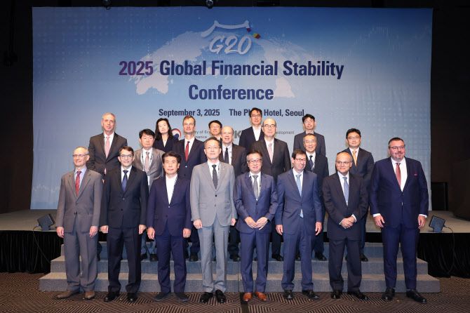 3일 서울 소공동 플라자호텔에서 기재부와 한국개발연구원(KDI)이 공동 개최한 ‘2025년 주요 20개국(G20) 글로벌 금융안정 컨퍼런스’에 참석자들이 단체사진을 찍고 있다. (사진=KDI) |