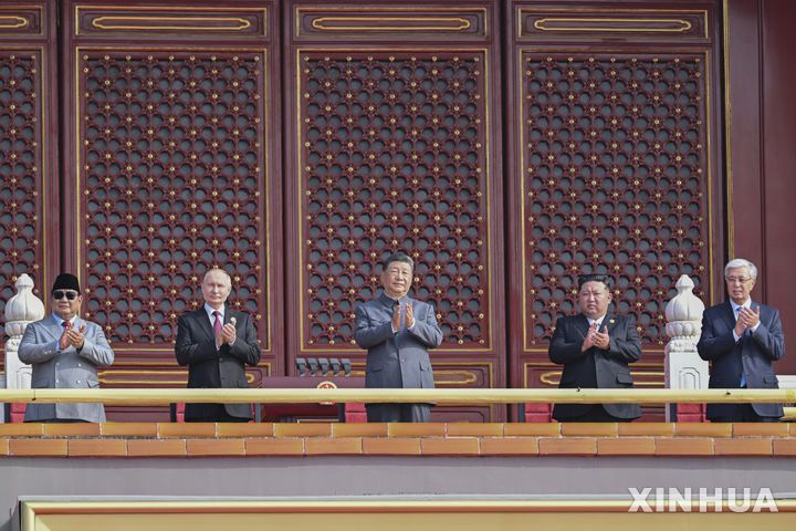 [베이징=신화/뉴시스] 시진핑 중국 국가주석이 3일(현지 시간) 베이징 톈안먼 성루(망루)에서 김정은(오른쪽에서 두 번째) 북한 국무위원장, 블라디미르 푸틴 러시아 대통령 등과 함께 자리해 광장에서 열린 '중국 인민 항일 전쟁 및 세계 반파시스트 전쟁 승리(전승절)' 80주년 기념 열병식을 보며 박수치고 있다. 사진 맨 왼쪽이 프라보워 수비안토 인도네시아 대통령. 2025.09.03. |
