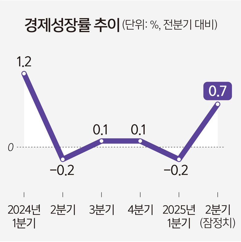 3일 한국은행이 발표한 ‘2025년 2분기 및 연간 국민소득(잠정)’에 따르면 올해 2분기 실질 국내총생산(GDP) 성장률(전기 대비)은 0.7%로 집계됐다. 소수점 둘째자리까지 보면 0.67%다. 상반기(1∼6월) 성장률은 0.3%로 지난 7월 발표된 속보치보다 0.1%포인트 올랐다.