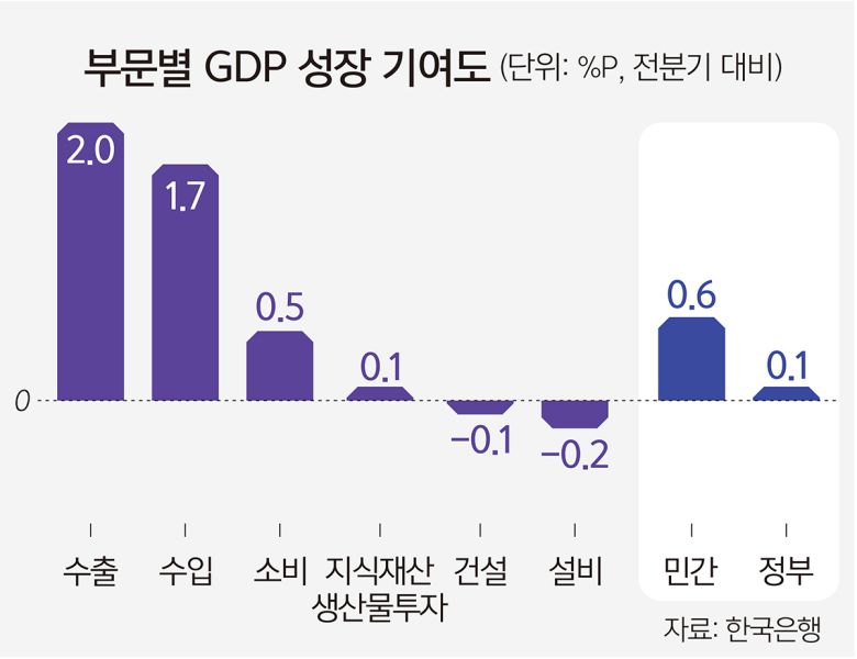 부문별로 내수가 0.4%포인트, 순수출(수출-수입)이 0.3%포인트 기여했다. 특히 내수 기여도는 1분기 -0.5%포인트에서 큰 폭으로 개선됐다. 내수 중에서도 승용차와 의료 서비스의 소비가 늘며 민간소비가 0.5% 증가했다. 정부소비는 건강보험급여비 지출을 중심으로 1.2% 늘었다. 수출은 미국 관세 여파에도 반도체와 석유·화학제품 등을 중심으로 4.5% 증가해 2020년 3분기 14.6% 상승 이후 최대 상승폭을 기록했다. 수입도 원유와 에너지류 등을 중심으로 4.2% 늘었다.