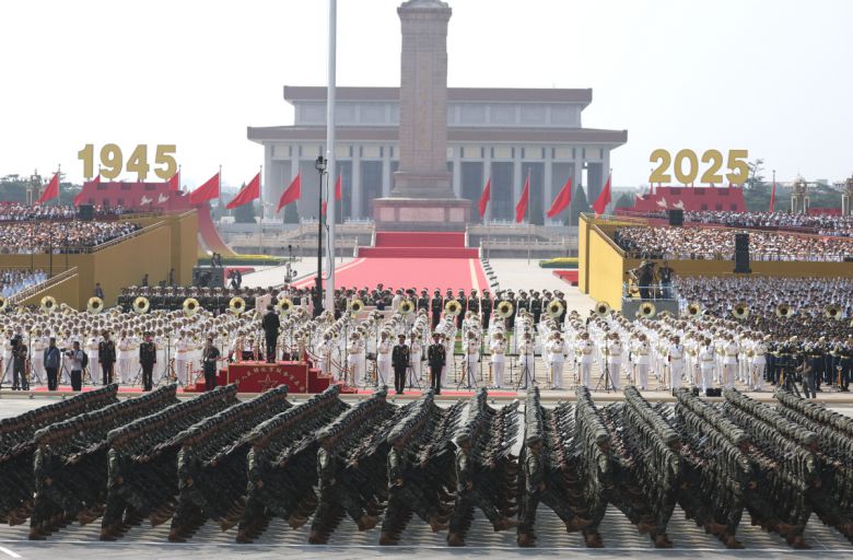 7분가량의 연설이 끝난 뒤 본격적인 열병식이 시작됐다. 시 주석은 차량에 올라 창안제(장안대로)를 따라 이동하며 열병 부대를 사열했다. 이번 열병식에는 1만명이 넘는 병력과 100여기의 항공기, 수백대의 지상 장비가 동원됐다. 병사들이 ‘주시 하오’(주석님 안녕하십니까), ‘웨이런민푸우’(인민을 위해 복무하겠습니다)라고 일제히 외치는 장면은 시 주석의 강력한 군권 장악을 상징적으로 보여줬다.