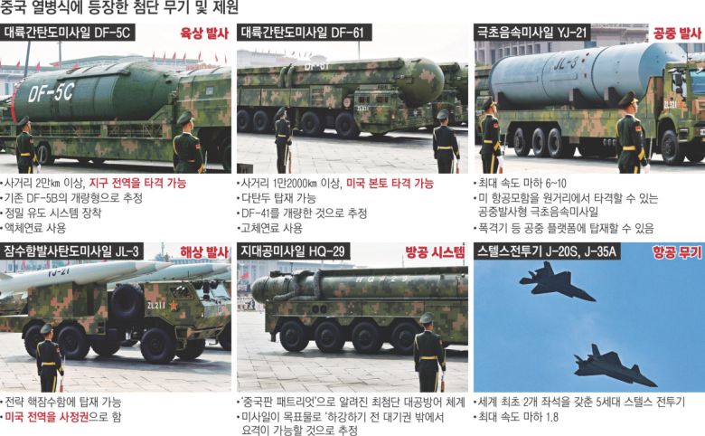 열병식의 주인공은 초음속 탄도미사일이었다. 둥펑(DF)-41의 후속 모델 ‘둥펑-61’이 등장하자 현장에서는 환호성이 터졌다. 사거리 1만5000㎞로 미국 전역을 사정권에 두는 대륙간탄도미사일(ICBM) DF-41에 이어, 사거리 2만㎞로 사실상 전 세계를 포괄하는 다탄두 대륙간전략핵미사일 DF-5C도 공개됐다.