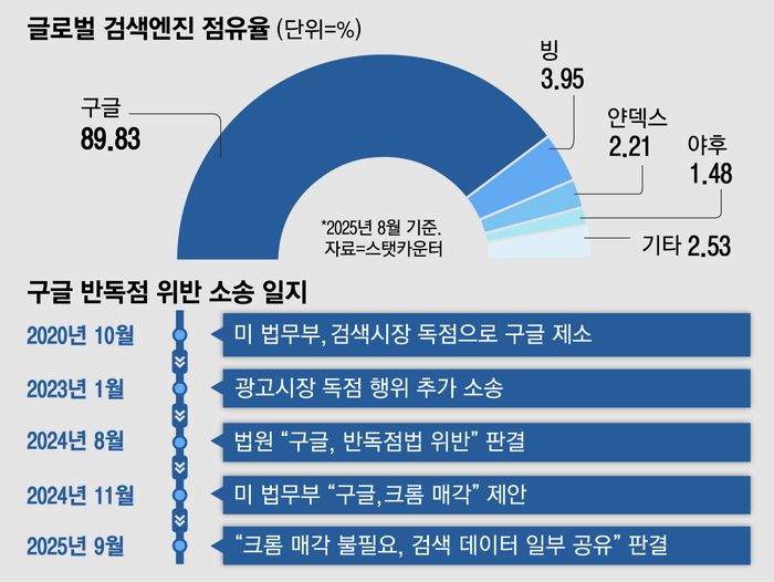 미 법무부는 2020년 구글이 애플·삼성 등과 배타적 계약을 맺어 인터넷 검색 시장 점유율 90%를 유지해왔다며 소송을 제기했다. 핵심 쟁점은 구글이 아이폰 사파리에 기본 검색 엔진으로 자리 잡기 위해 매년 약 200억달러를 애플에 지급하고 있다는 점이었다. 이외에도 크롬 브라우저, 안드로이드 운영체제를 활용해 검색 지배력을 공고히 한 행위가 문제로 지적됐다. 미 법부는 이러한 행위가 경쟁사를 시장에서 배제하는 독점적 구조라며 구글에 크롬과 안드로이드 분리 매각 같은 강력한 구조적 시정 조치를 요구했다. 이는 1990년대 마이크로소프트 사건 이후 처음으로 제기된 대형 분할 요구였다.