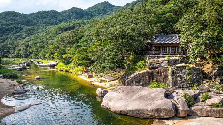화양구곡 주차장에 있는 팔각정 휴게소 식당은 평일엔 운영하지 않는다. 계곡 따라 걸으면 산채비빔밥 등을 파는 식당이 여럿 있다. 청천면 푸른내시장 인근 식당에선 미꾸리매운탕, 올갱이해장국, 버섯전골 같은 토속적인 음식을 낸다. 올갱이해장국에 도전했다. 1만원.