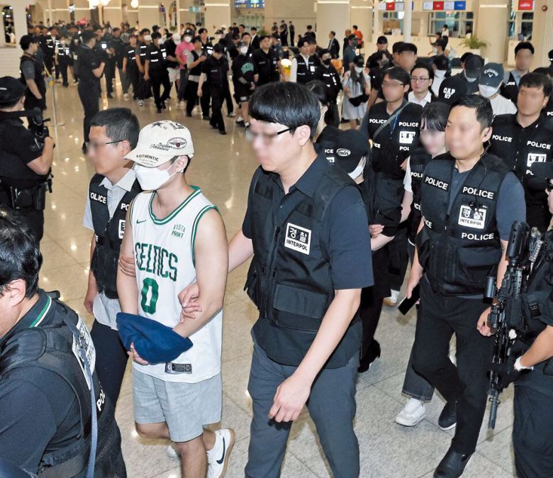 필리핀으로 도피했다가 현지에서 붙잡힌 한국 범죄자 49명이 3일 인천국제공항 제1터미널을 통해 송환되고 있다. 범죄 피의자 해외 송환 사례 중 역대 최대 규모다. 이들 중 보이스피싱 등 사기 피의자가 25명으로 가장 많았고, 사이버 범죄와 강력 범죄 피의자가 각각 17명, 3명이었다. 지난해 필리핀 세부에서 손도끼로 한국인 관광객을 협박해 현금 1000만원을 뜯어낸 2인조 강도, 2018년부터 5조3000억원 규모의 온라인 불법 도박 사이트를 운영한 범죄 조직원, 기업 자금 200억원을 횡령하고 16년간 해외 도피한 중소기업 대표 등이 이날 송환됐다.