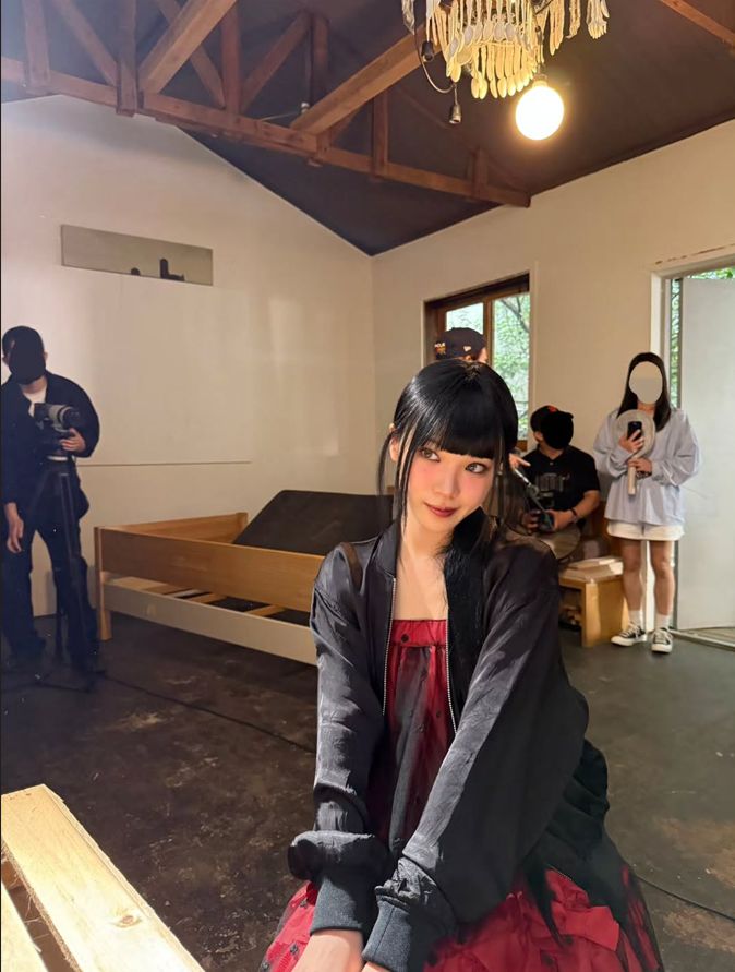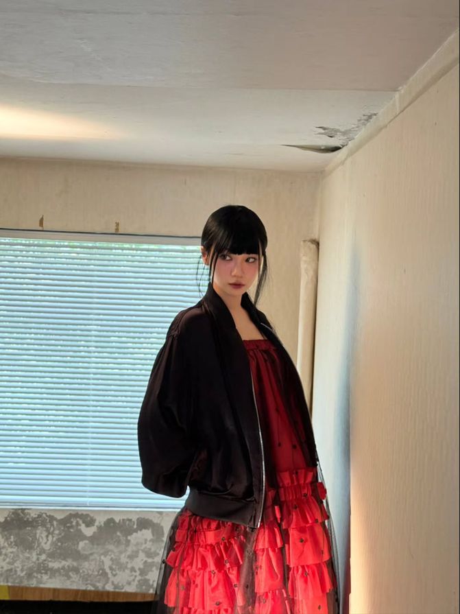 레드 드레스 위에 블랙 아우터를 걸쳐 드라마틱한 무드를 자아냈다. 풍성한 실루엣과 강렬한 색감이 조화를 이루며 고혹적인 분위기를 완성했다.