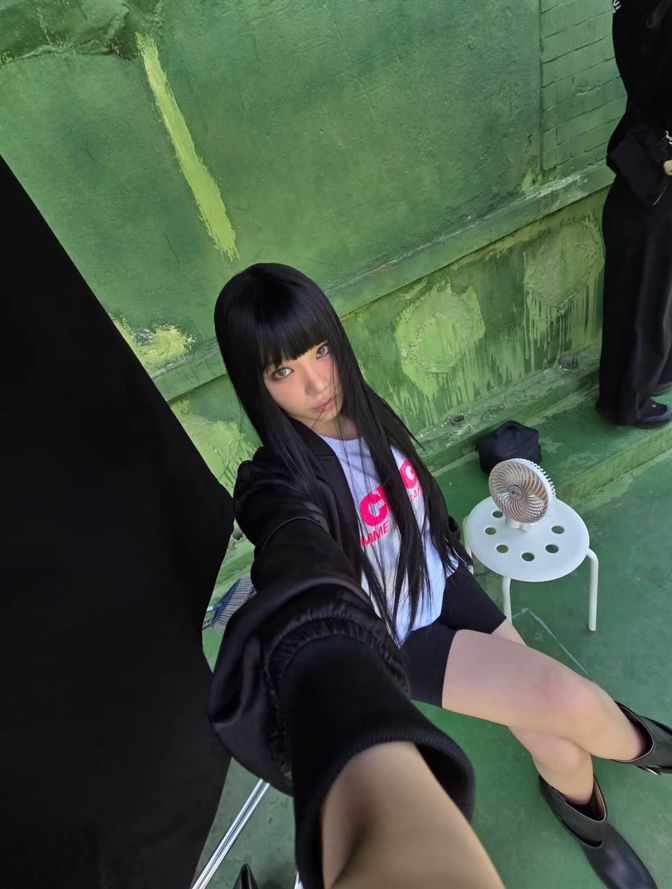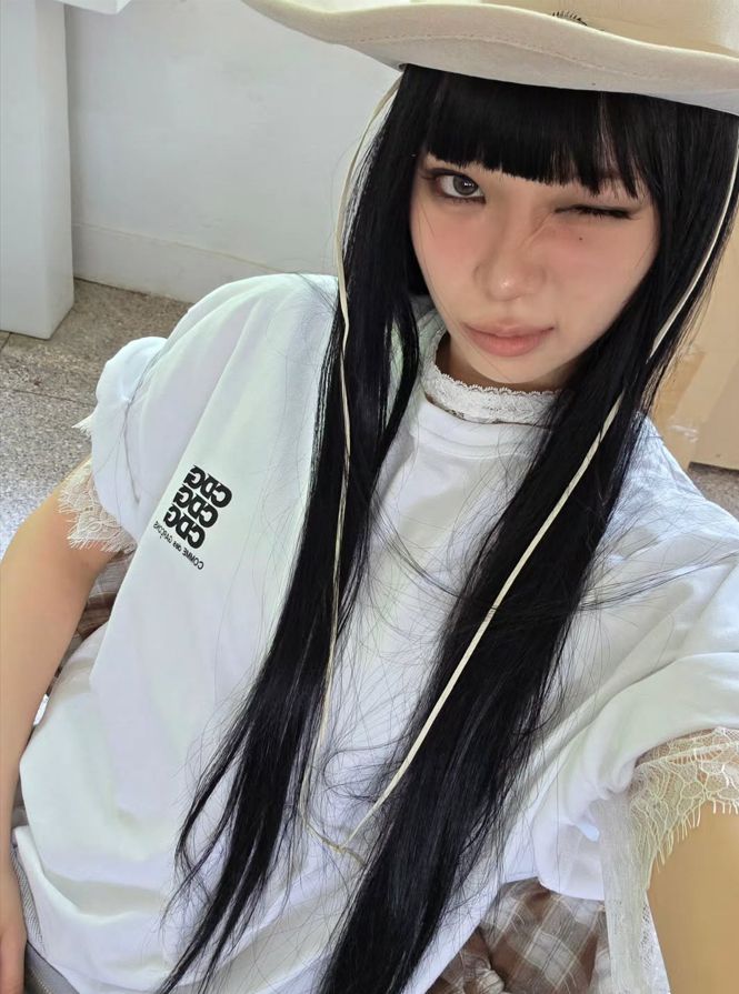 사진 속 그는 블랙 재킷과 화이트 티셔츠, 사이클 팬츠를 매치해 캐주얼하면서도 스트릿 감각이 느껴지는 스타일을 선보였다. 긴 흑발 가발과 함께한 윙크 포즈가 색다른 매력을 더했다.