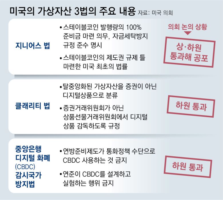 여기에 올해 7월 미 의회에서 스테이블코인의 달러 및 미 국채 담보 규정을 명확히 한 지니어스 법(GENIUS Act)이 통과돼 민간 참여의 길을 터 줬다. 가상자산가 증권인지 상품인지 명확히 해 규제 기관을 구분한 ‘클래리티 법(CLARITY Act)’ 등도 하원을 통과하고 상원에서 계류 중이다.