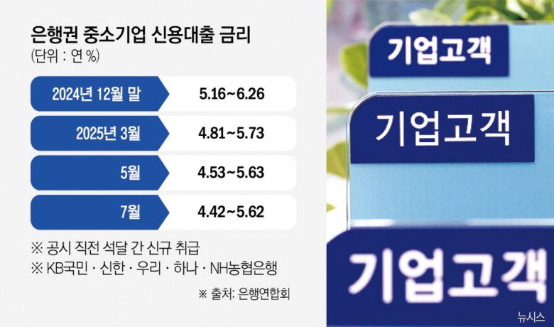 3일 은행연합회에 따르면 5대 시중은행(KB국민·신한·우리·하나·NH농협)의 지난달 중소기업 신용대출 금리(신규취급액 평균 금리)는 연 4.42~5.62% 수준으로 집계됐다. 한국은행이 두 차례 기준금리를 내린 직후인 5월(4.53~5.63%)과 비교했을 때 사실상 변동이 없다. 중소기업 차주들은 이자 부담 완화를 체감하기 어려운 상황이다.