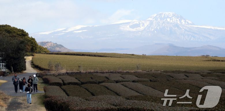 2월 21일 오후 제주 서귀포시 언덕면 오설록 녹차밭을 찾은 관광객들이 눈 쌓인 한라산을 배경으로 막바지 겨울 정취를 즐기고 있다. 2025.2.21/뉴스1 ⓒ News1 오현지 기자