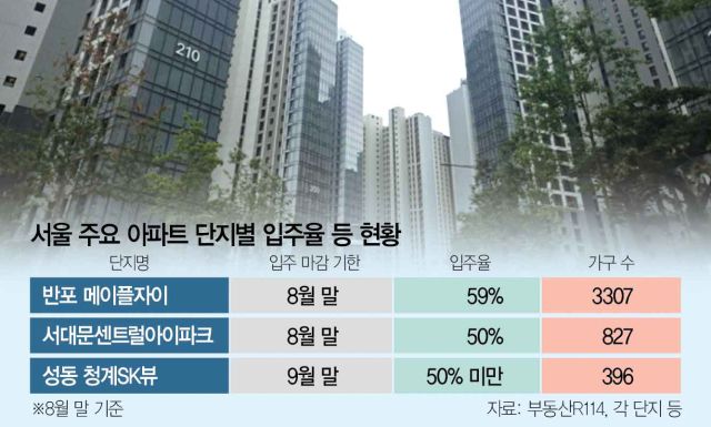 3일 건설업계에 따르면 메이플자이는 3307가구 가운데 약 1950가구가 입주하는 데 그친 것으로 나타났다. 입주 마감 시점인 지난달 말 기준 입주율은 59% 수준에 머물렀다. 입주율이 현저히 낮은 탓에 피트니스센터, 수영장 등 커뮤니티 시설도 아직 개방되지 않은 상황이다. 식당과 카페테리아 등도 이달 16일 이후에야 이용이 가능한 것으로 알려졌다. 서울의 또 다른 신축단지인 서대문센트럴아이파크 역시 상황은 비슷하다. 총 827가구가 들어서는 서대문센트럴아이파크의 입주율은 50% 수준에 머물렀다. 지난달 입주를 시작한 성동구 청계SK뷰도 수분양자의 절반가량이 아직 입주하지 못하고 있다.