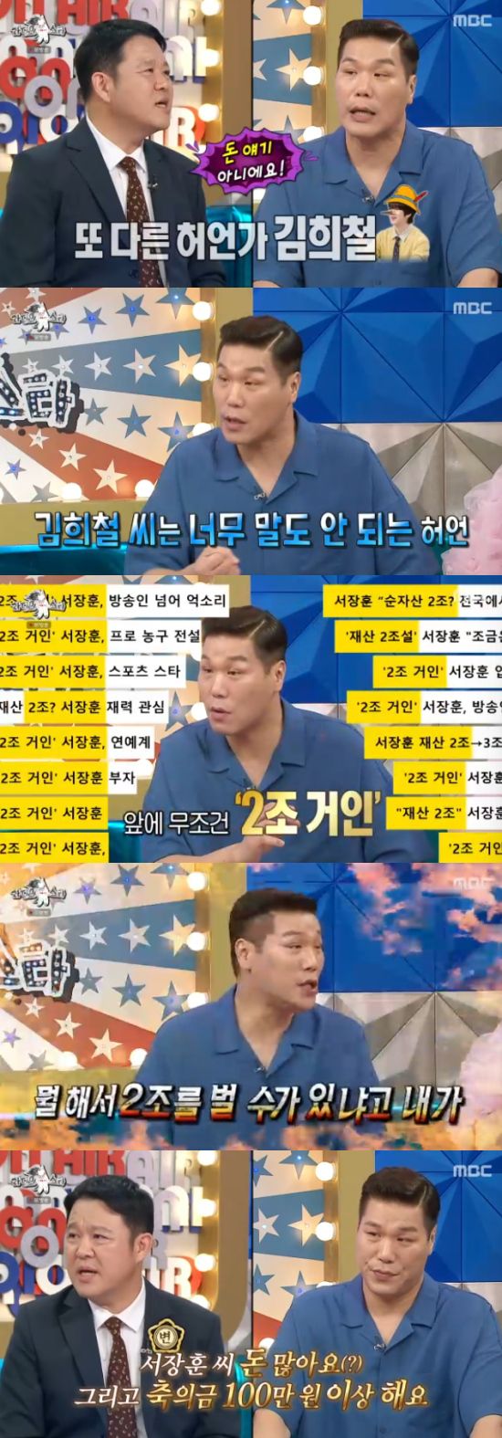 이날 방송에서 서장훈은 '재산 2조'설에 대해 "김희철 때문에 그 말이 나왔다. 처음에는 2조가 아니라 몇 천 억이었는데, 2조까지 커졌다. 그런데 그 말을 100명 중 5명은 믿는 것 같다. 저에 대한 기사 제목에 '2조 거인'이 항상 붙어 있더라"고 했다.