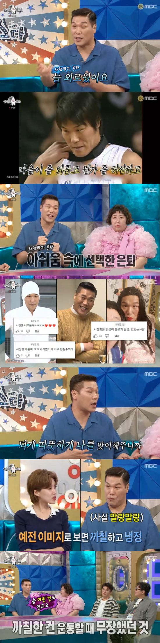 서장훈의 말에 장도연은 "선수시절 이미지로만 보면 까칠해보이시는데 말랑말랑한 분이셨다"고 했고, 서장훈은 "까칠함은 선수일 때 무장했던 모습이다. 사실 여린 부분이 있다"고 말하며 사랑을 주는 시청자들에게 고마운 마음을 드러냈다.