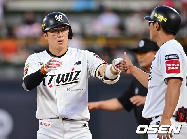 [OSEN=수원, 이후광 기자] 이래서 KT 위즈가 스토브리그에서 35살 베테랑에 40억 원이라는 적지 않은 금액을 안겼나보다. 허경민이 리드오프를 맡아 5안타 1볼넷 6출루에 성공하며 팀의 극적인 공동 4위 도약을 이끌었다.