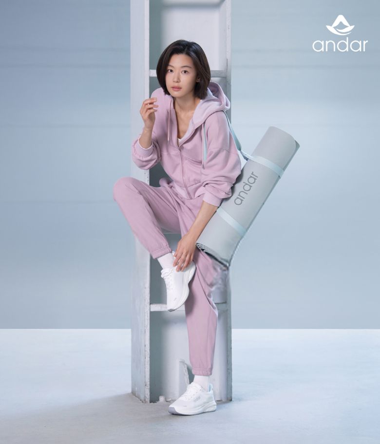 안다르는 화보를 통해 원마일 웨어부터 일상까지 활용 가능한 가을·겨울 스타일을 제안했다. 포근한 질감이 돋보이는 ‘소프트 플리스’ 셋업이 대표적이다. 크롭 기장의 후디 집업과 조거팬츠의 조합이 전지현의 건강한 이미지와 잘 어우러진다.