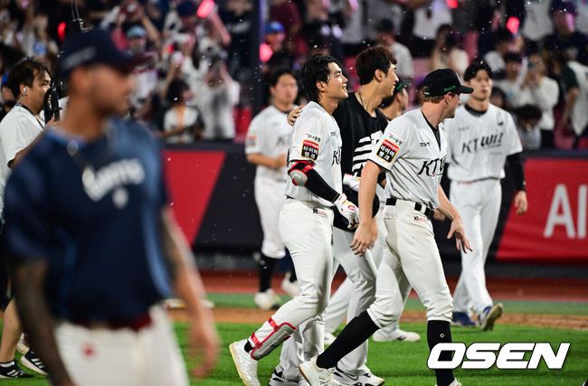 [OSEN=수원, 박준형 기자] 프로야구 KT 위즈가KIA 타이거즈를 꺾고 전날 패배를 설욕했다.KT는 30일 수원 KT위즈파크에서 열린 2025 KBO리그KIA와 경기에서 8-2로 승리했다.경기종료 후 KT 선수들이 승리의 기쁨을 나누고 있다. 2025.08.30 / soul1014@osen.co.kr |