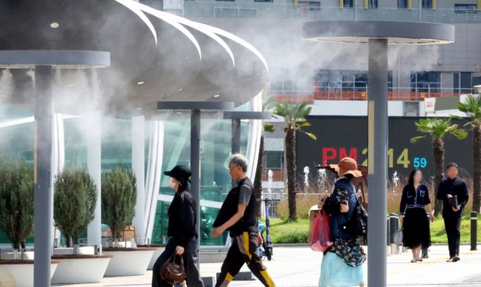 지난달 25일 대구 동구 동대구역 광장에 설치된 쿨링포그 아래로 시민들이 이동하고 있다./사진=뉴시스. |