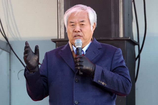 지난 2월20일 오후 서울 종로구 헌법재판소 대심판정에서 열려 인근에서 탄핵 반대 단체의 집회가 열린 가운데 전광훈 목사가 무대에서 발언하고 있다. 김영원 기자 forever@hani.co.kr