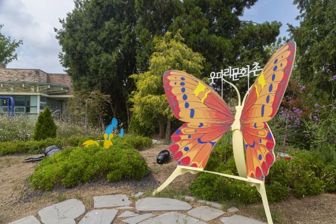 평택 서탄면 들녘 사이를 달리다 보면 소박한 금각리 마을을 만나게 된다. 마을회관 앞에는 버스가 회차하는 작은 공터가 있고 맞은편에는 폐교된 금각초등학교가 자리하고 있다. 교내의 화단에는 아기자기한 조각품들이 전시되어 있다. ‘오줌싸개’ 동상이나 ‘책 읽는 소녀’ 석고상이 있었을 법한 자리다. 학생들이 뛰어놀던 운동장은 초록색 잔디가 깔려 있고 주변은 키 높은 메타세쿼이아 나무들이 둘러서 있어 마치 울타리처럼 아늑하다. 이곳이 바로 문화의 숨결이 머무는 공간인 웃다리문화촌이다.
