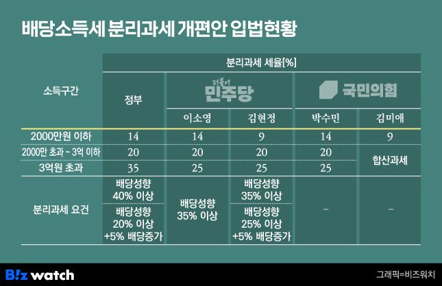 앞서 지난 4월 이소영 의원이 최고세율 25%안을 발의한데 이어 같은 당 김현정 의원은 최고세율을 25%로 하되, 2000만원 이하의 배당소득은 지금보다 5%포인트 더 낮은 9%로 하자는 소득세법 개정안을 지난달 19일 발의했다.