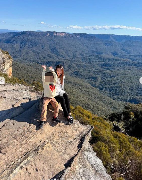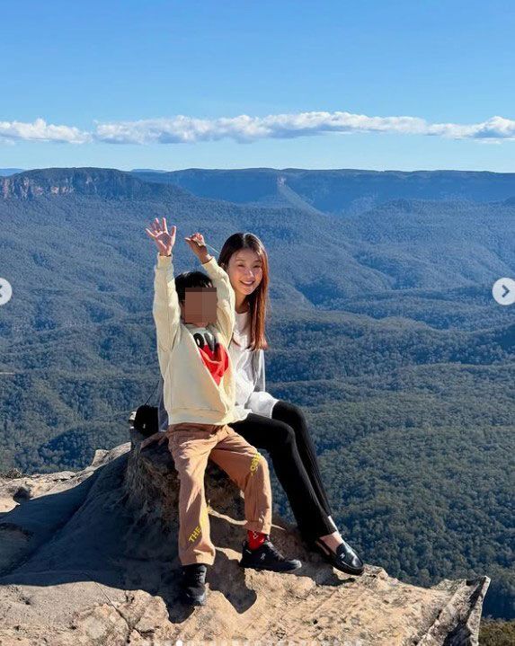공개된 사진 속 이시영은 아들과 함께 호주 블루마운틴 절벽 가장자리에 앉아 환한 미소를 지어 보이고 있다.