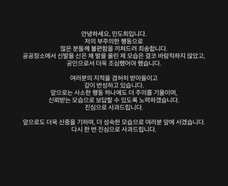 이에 민도희는 "여러분의 지적을 겸허히 받아들이고 깊이 반성하고 있다"며 "앞으로는 사소한 행동 하나에도 더 주의를 기울이며, 신뢰받는 모습으로 보답할 수 있도록 노력하겠다"며 재차 사과했다.