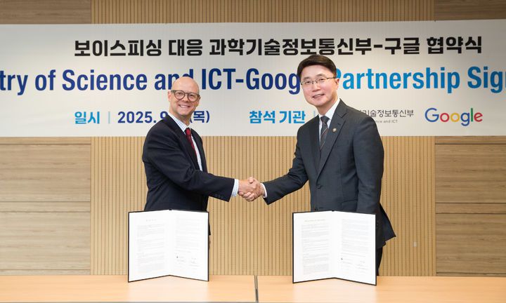 [서울=뉴시스] 과학기술정보통신부는 4일 서울 종로구 국가과학기술자문회의 대회의실에서 보이스피싱 등 민생범죄 예방을 위해 구글과 업무협약을 체결했다고 밝혔다. 사진 오른쪽부터 류제명 과기정통부 2차관, 데이브 클라이더마허 구글 보안책임자(부사장). (사진=과기정통부 제공) 2025.09.04. photo@newsis.com *재판매 및 DB 금지 |