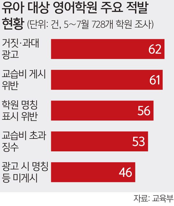 이번 조사에선 영어학원의 불법행위들도 대거 적발됐다. 교육부에 따르면 이번 점검으로 총 260개 학원에서 384건의 위반 사항이 적발됐다 ▲거짓·과대광고 62건 ▲교습비 게시 위반 61건 ▲학원 명칭 표시 위반 56건 ▲교습비 초과징수등 53건 ▲광고 시 명칭 등 미게시 46건 ▲시설위반 25건 등이다. ‘성범죄 등 경력 미조회’도 2건 있었다. 이들 학원은 교습정지(14건), 과태료 부과(70건), 벌점·시정명령(248건) 등의 처분을 받았다.
