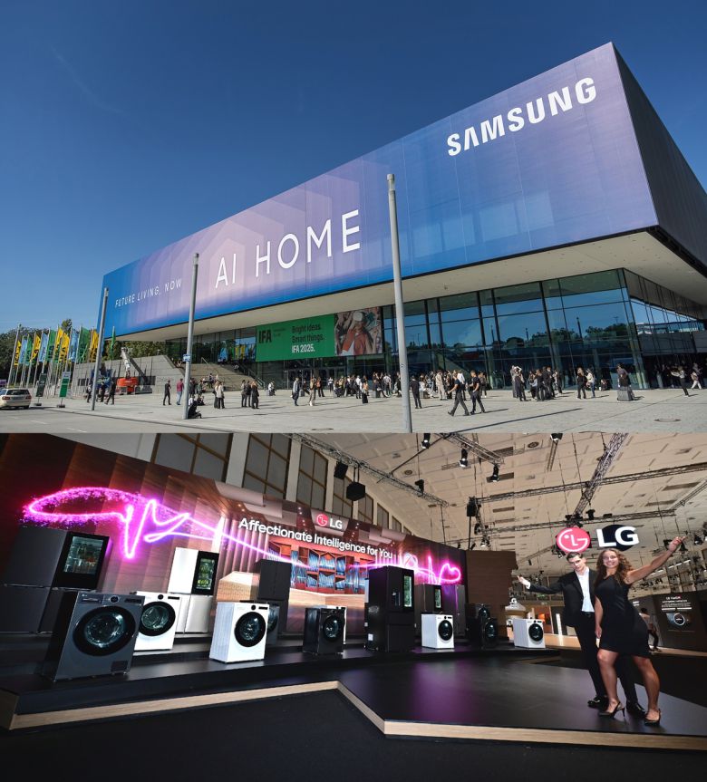 유럽 최대 가전 전시회인 ‘IFA 2025’에서 손님맞이 준비를 마친 삼성전자(위 사진)와 LG전자(아래)의 전시관 내외부 모습. 삼성전자·LG전자 제공