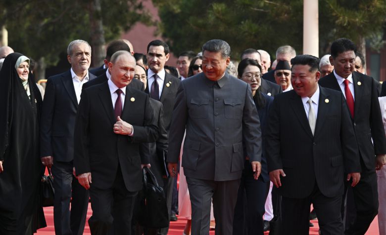 블라디미르 푸틴 러시아 대통령, 시진핑 중국 국가주석, 김정은 북한 국무위원장(왼쪽부터)이 지난 3일 베이징 톈안먼 광장에서 열린 중국 전승절 80주년 기념행사에 참석하기 위해 성루로 걸어가며 이야기하고 있다. 베이징|AP연합뉴스 |