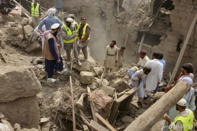 [마자르다라=AP/뉴시스] 1일(현지 시간) 아프가니스탄 쿠나르주 마자르다라에서 민방위대원, 주민, 군인들이 지진으로 무너진 집 잔해를 치우며 생존자를 찾고 있다. 탈레반 당국은 지난달 31일 아프간 동부 지역을 강타한 규모 6.0의 강진으로 지금까지 사망자 숫자는 1400명을 넘어서고, 부상자는 3300명에 달한다고 밝혔다. 2025.09.03. /사진=민경찬 |