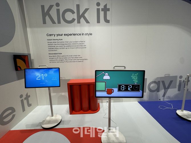 4일(현지시간) 독일 베를린 ‘IFA 2025’ 삼성전자 전시장에 무선 이동형 스크린 ‘더 무빙스타일’이 전시돼 있다. 사진은 모니터를 분리한 뒤 모니터에 부착된 ‘킥 스탠드’를 통해 더 무빙스타일을 거치한 모습.(사진=공지유 기자)