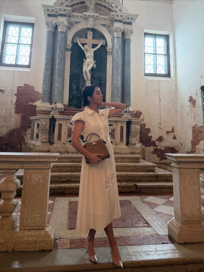 해당 사진에서 이민정은 고풍스러운 제단이 배경이 된 실내에서 흰색 셔츠 원피스와 힐, 브라운 톤 미니 백을 들고 우아한 포즈를 취하고 있다. 마치 패션 화보를 방불케 하는 분위기이며, 사진 속 예수상이 크게 드러나 있어 ‘가방 홍보’로 오해를 받았다.