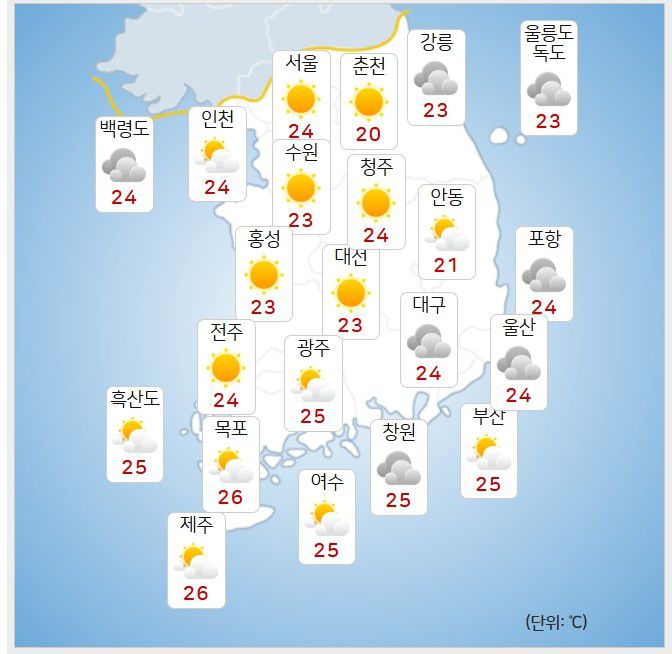 최고기온은 △서울 33도 △인천 32도 △춘천 32도 △강릉 30도 △대전 33도 △대구 33도 △전주 34도 △광주 32도 △부산 32도 △제주 32도 △울릉도 독도 28도 등이다.