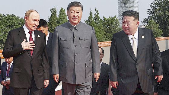 함께 걸으며 대화 나누는 푸틴 러시아 대통령(왼쪽)과 시진핑 중국 국가주석(가운데). [AFP=연합뉴스] |