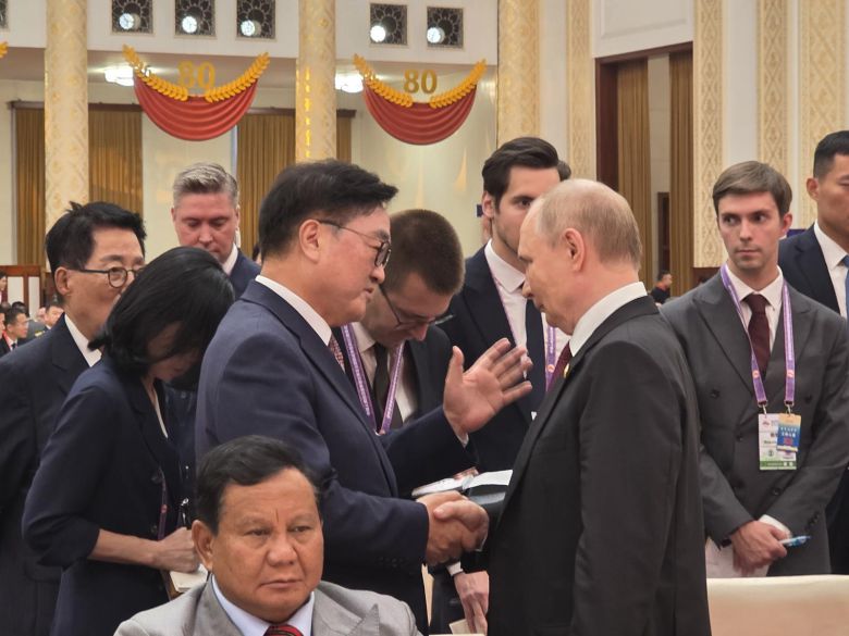 우원식 국회의장이 3일 중국 베이징에서 열린 전승절 80주년 기념식 리셉션에서 블라디미르 푸틴 러시아 대통령과 대화하고 있다. (국회의장실 제공) 2025.9.3 |