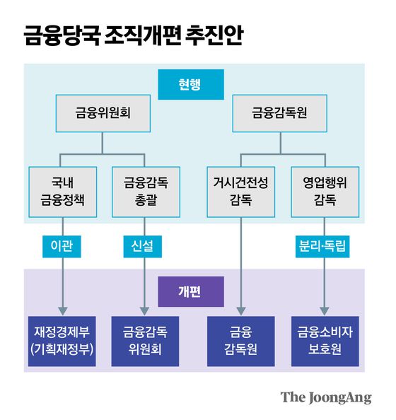 정부와 여당이 금융위원회와 금융감독원으로 나뉘어 있는 국내 금융 정책·감독 기능을 4개 기관(재정경제부·금융감독위원회·금융감독원·금융소비자원)으로 쪼개기로 했다. 또 금감원과 금소원은 공공기관으로 전환하는 방안도 추진한다. 금융 정책과 감독 기능을 분리하고, 소비자 보호를 강화하기 위해 관련 조직을 신설한다는 취지다. 하지만 조직이 여러 개로 나뉘면서 금융사의 ‘관치 리스크’만 커진다는 비판도 나온다.