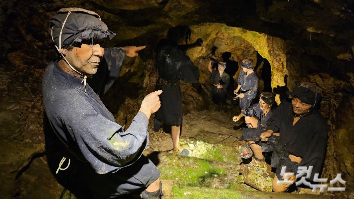 일본 니가타현 사도섬 아이카와에 위치한 사도광산의 소다유 갱도 내 전시된 에도시대 채광모습을 표현한 마네킹들. 최원철 기자