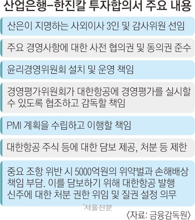 한진칼 지분 10.58%를 보유한 산은이 조 회장의 백기사가 됐다는 비판을 해소하기 위해 산은은 한진칼과 ‘항공산업 구조개편 추진 등을 위한 투자합의서’를 체결했다. 투자합의서엔 ▲산은이 지명하는 사외이사 3명 선임 ▲주요 경영사항에 대한 사전협의권 및 동의권 준수 ▲대한항공 경영평가 실시 및 감독 책임 등 7가지 준수 사항이 담겼다. 당시 산은은 “경영평가를 통해 미흡하다고 판단되면 조 회장이 경영 일선에서 퇴진한다는 의무도 부여했다”고 밝혔다.
