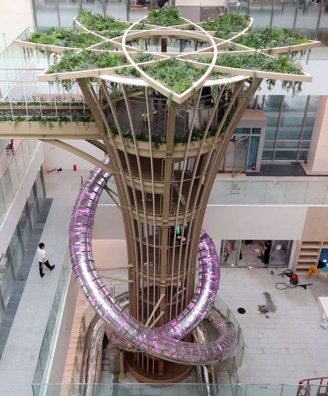 D-라이드는 단순히 구민에게 즐거움을 주기 위한 놀이시설이 아니다. 미끄럼틀을 일종의 유인책으로 삼아 자연스럽게 신청사를 찾는 환경을 만들기 위한 박 구청장의 세심한 배려다. 지하 3층에서 지상 10층 규모(연면적 4만 4672㎡)로 만들어진 신청사는 행정과 상업 기능이 공존하는 ‘관상 복합청사’다. 상가 매출이 늘면 구청 수익도 늘어나는 구조인 셈이다.