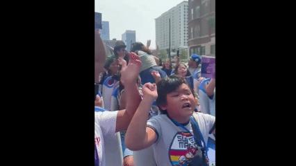 미국 넷플릭스가 깜짝 기획한 'K팝 데몬 헌터스' 노래방 버스'에서 애니메이션 수록곡 '소다 팝'을 부르는 외국 아이들 모습. 이 버스는 지난달 시카고에서 운행됐다. 미국 넷플릭스 제공